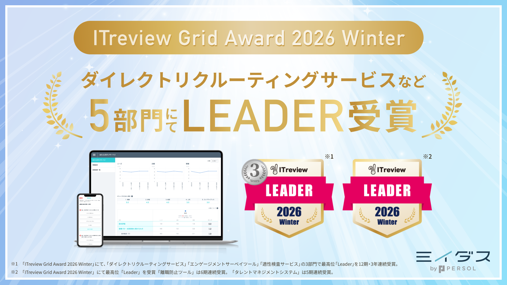 「はたらいて、笑おう。」をビジョンに掲げるパーソルグループの中途採用サービス『ミイダス』を運営するミイダス株式会社(本社:東京都渋谷区、代表取締役社長:後藤 喜悦)は、アイティクラウド株式会社(本社:東京都港区、代表取締役社長兼CEO 黒野 源太)が主催する「ITreview Grid Award 2026 Winter」にて、5部門で最高位の「Leader」を受賞しました。