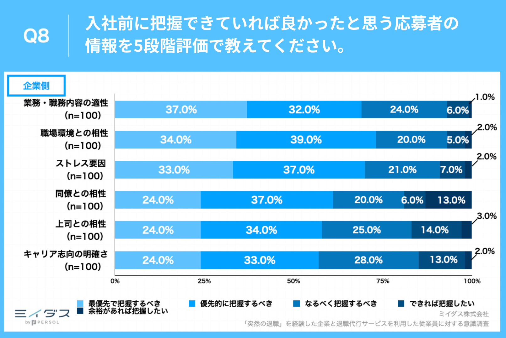 従業員が突然退職に至る背景には「採用時のミスマッチ」と「入社後の職場環境への不適応」という2つの課題が存在しており、採用段階では、職務内容の丁寧な説明に加え、応募者の行動特性や働き方の傾向を多角的に把握することが重要ということが明らかになりました。